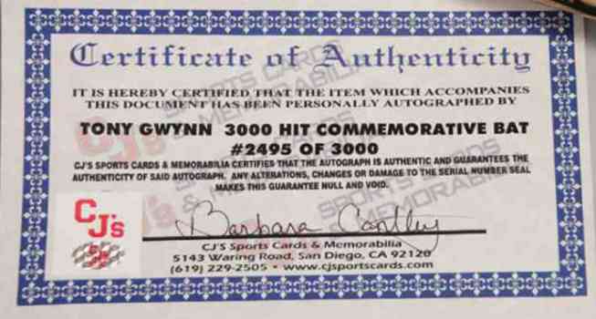 The bats come with a Certificate of Authenticity from C.J.'s of San Diego under an exclusive