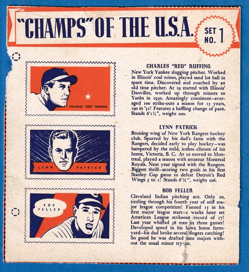| out | 1940 Wheaties #1 BOB FELLER/Lynn Patrick (Hockey)/Red Ruffing (Yankees) Feller ROOKIE 8 yrs BEFORE Bowman !! Even low grade common panels are rare - this has 2 HALL-of-FAMER's ! Nicer ones $350/$139 on eBay. |