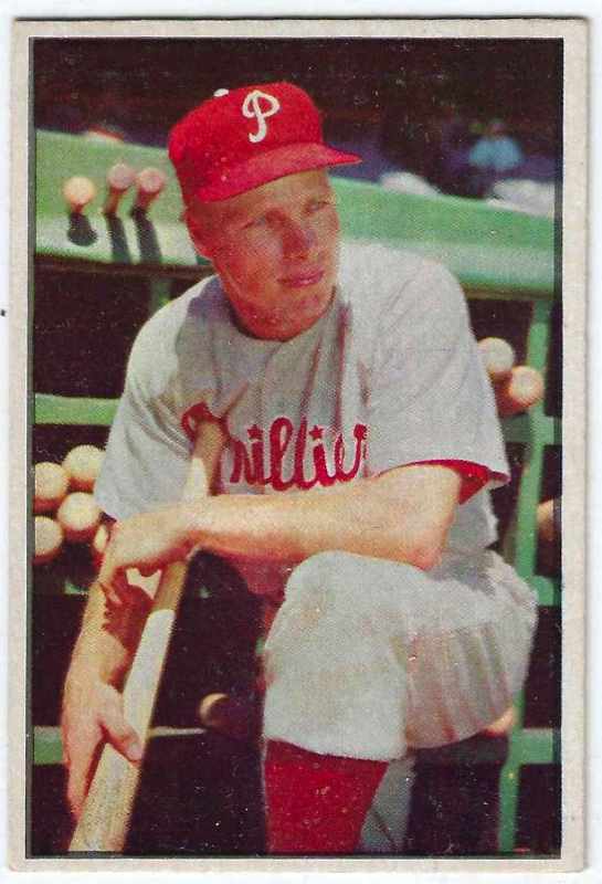 1953 Bowman Color #103 Del Ennis (Phillies) There is a light discolorization in top left corner. |