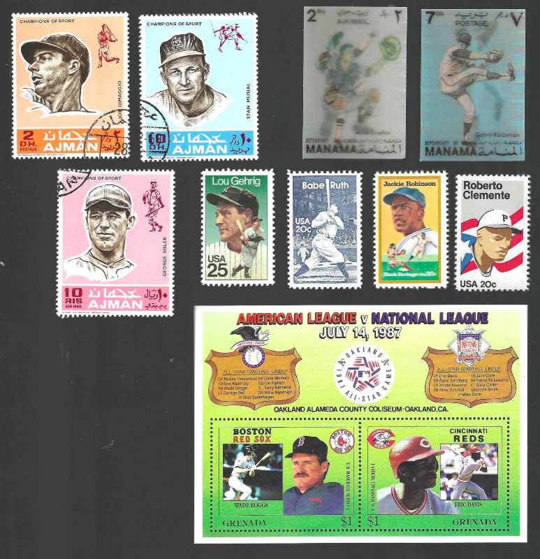 BASEBALL Postage Stamp Collection - Lot of (10) different (1969-1988) [NM/MINT] $30+ value. U.S.,1969 Ajman,1972 Manama,1987 Grenada w/Boggs government postage stamps! Jackie Robinson,Roberto Clemente,Lou Gehrig,Ajman w/DiMaggio,Cobb,Musial... |