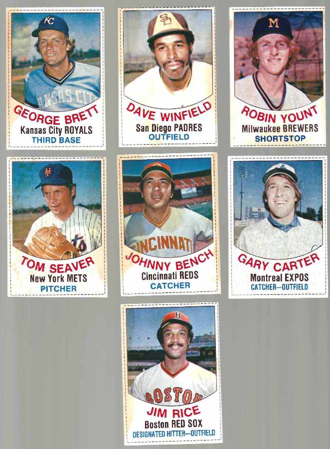 1977 Hostess TWINKIES/CUPCAKES - Lot of (50) different w/10 HOFers [#l] [Most EX/MT-NrMt,w/st] Some lower. Great break value !!! Most with usual 'Twinkies' stains. Just the (7) pictured Hall-of-Famers list $177 in Beckett(ExMt-NM). w/George Brett,Tom Seaver,Johnny Bench,Yount,Gary Carter,Winfield & Rice... PLUS Fingers & Carl Yastrzemski. |