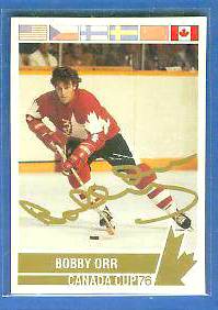 | out | Bobby Orr - 'Canada Cup 76' blank-backed card AUTHENTIC GOLD AUTOGRAPH !!! The only one found one eBay is $900. (Notice this has gold banner at bottom ... not the more common red). |