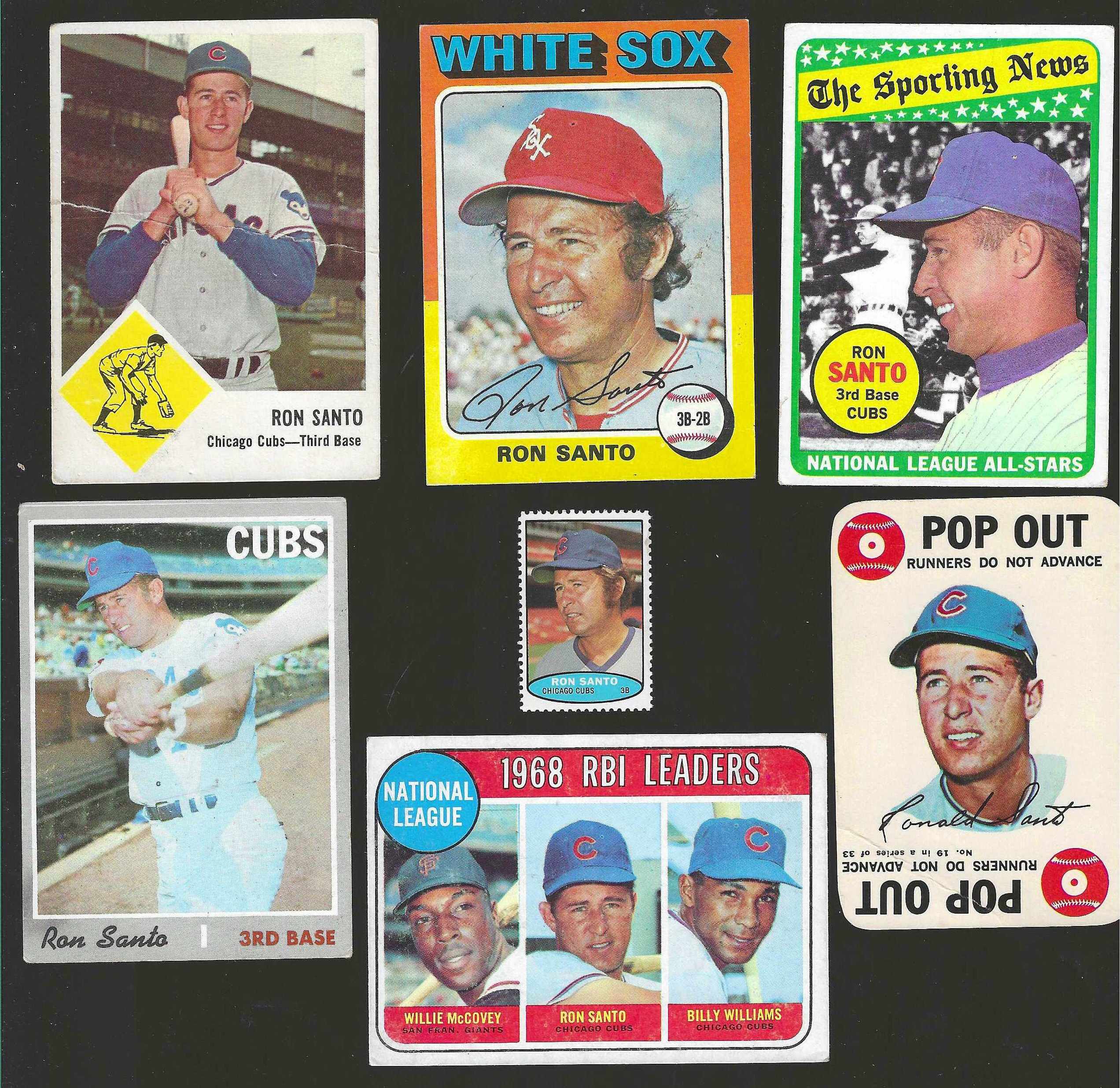 Ron Santo *** VINTAGE COLLECTION *** - Lot of (7) different (1963-1975) [VG to EX] With 1963 Fleer, 1968 Topps Game, 1969 Topps All-Star and Leaders card, 1970 Topps hi#, 1974 Topps Stamp (NM/MINT) and 1975 Topps. |