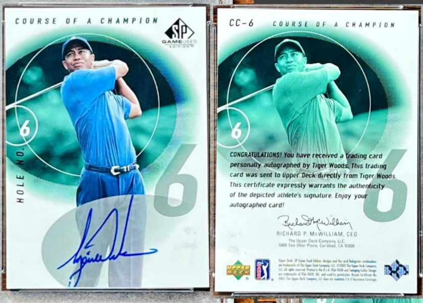 TIGER WOODS - 2002 SP Game-Used AUTOGRAPHED INSERT #CC-6 [NM/MINT] Beautiful certified Tiger Woods signed card. The back is the COA from Upper Deck and the PGA Tour. Prices on eBay ranged from $2,100 to $2,800 for cards from this issue. |